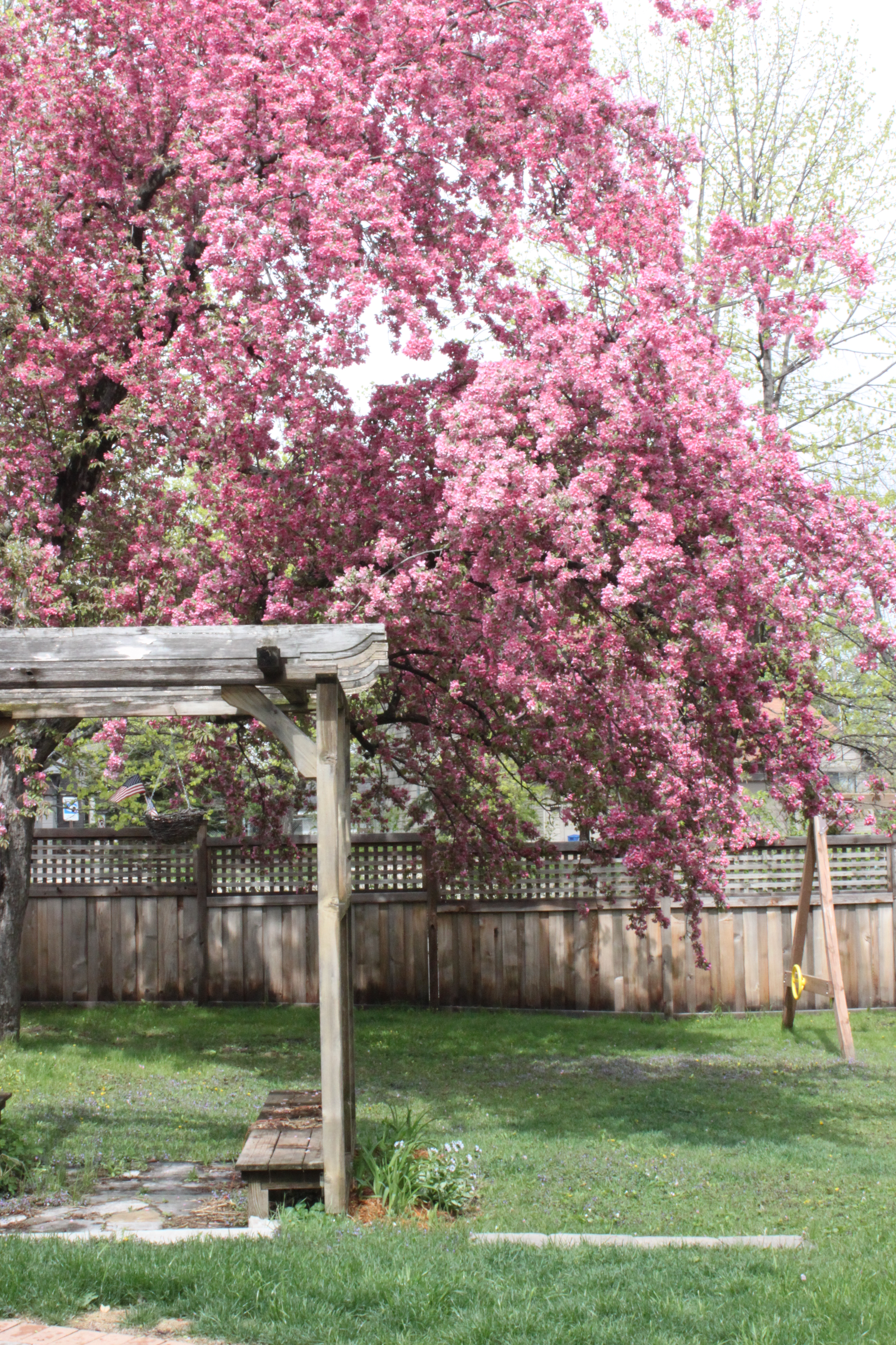 Our house was built in 1940 and while it’s doubtful the tree is 70 years old, it’s likely a good 40 or 50. It stands so tall, so full, so beautiful with its dark pink blossoms and branches that call you to climb or hang from them.