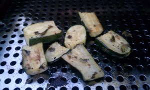 Note: We used a grill pan to prevent some of the smaller pieces from falling through the grates, but zucchini could be put directly on grates as well. (That’s how Megan did it and the grill marks were quite pretty too.)