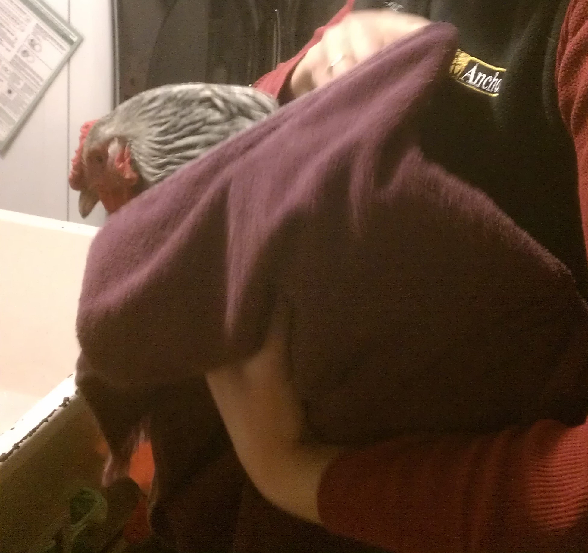 Me: Go out to coop with a bath towel and pick-up chicken by holding her wings in. Proudly come back to house with towel over her back and tail leaving her head and neck fully exposed. But I got her. Check.